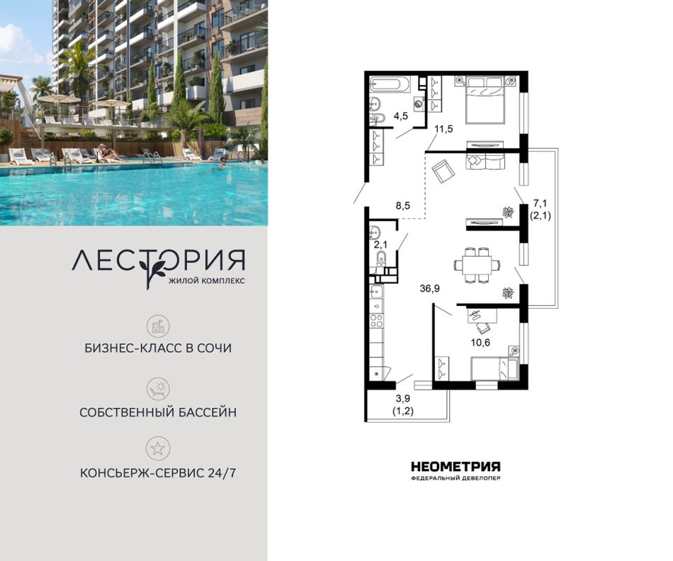 Продается квартира в жилом комплексе бизнес-класса «Лестория». В составе ЖК предусмотрена собственная аквазона площадью 473 квадратных метра с двумя подогреваемыми бассейнами, что соответствуют стандартам бизнес-класса.