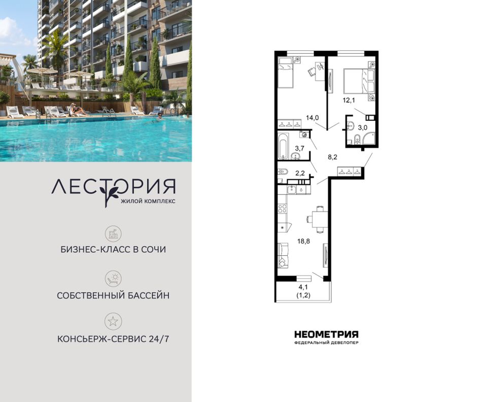 Продается квартира в жилом комплексе бизнес-класса «Лестория». В составе ЖК предусмотрена собственная аквазона площадью 473 квадратных метра с двумя подогреваемыми бассейнами, что соответствуют стандартам бизнес-класса.