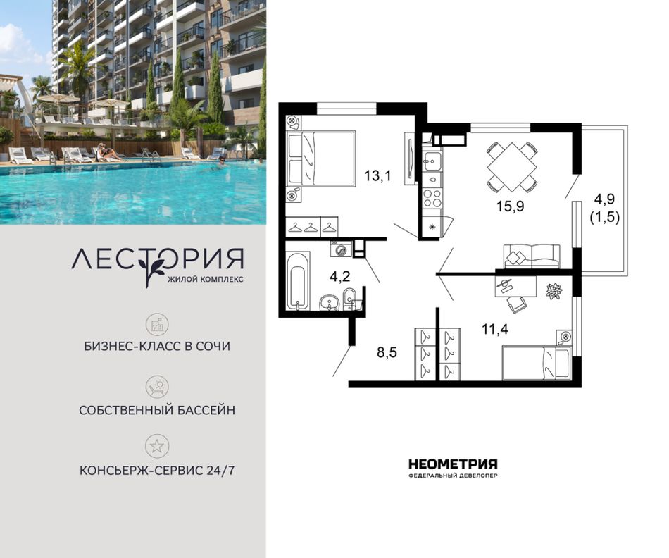 Продается квартира в жилом комплексе бизнес-класса «Лестория». В составе ЖК предусмотрена собственная аквазона площадью 473 квадратных метра с двумя подогреваемыми бассейнами, что соответствуют стандартам бизнес-класса.