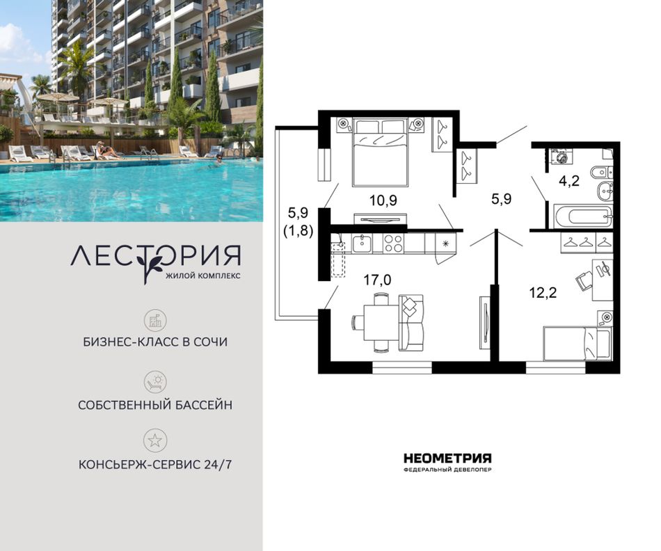 Продается квартира в жилом комплексе бизнес-класса «Лестория». В составе ЖК предусмотрена собственная аквазона площадью 473 квадратных метра с двумя подогреваемыми бассейнами, что соответствуют стандартам бизнес-класса.