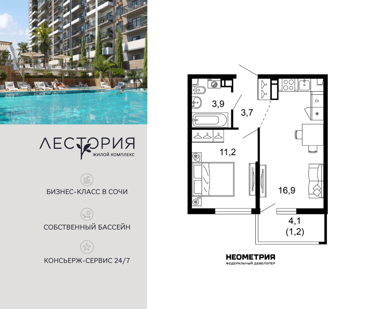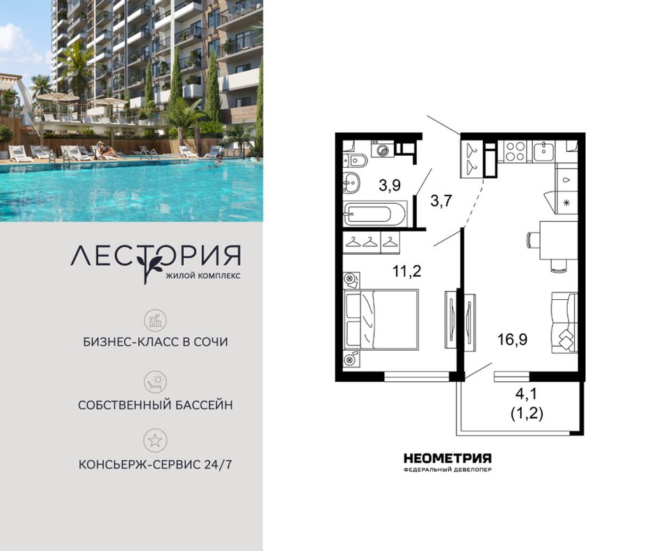 Продается квартира в жилом комплексе бизнес-класса «Лестория». В составе ЖК предусмотрена собственная аквазона площадью 473 квадратных метра с двумя подогреваемыми бассейнами, что соответствуют стандартам бизнес-класса.