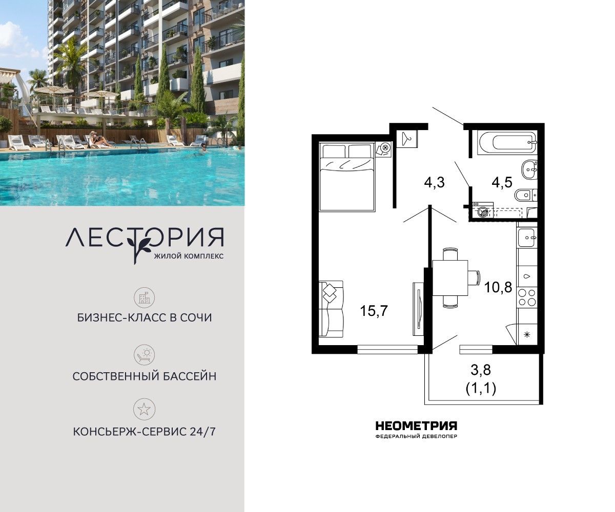 Продается квартира в жилом комплексе бизнес-класса «Лестория». В составе ЖК предусмотрена собственная аквазона площадью 473 квадратных метра с двумя подогреваемыми бассейнами, что соответствуют стандартам бизнес-класса.