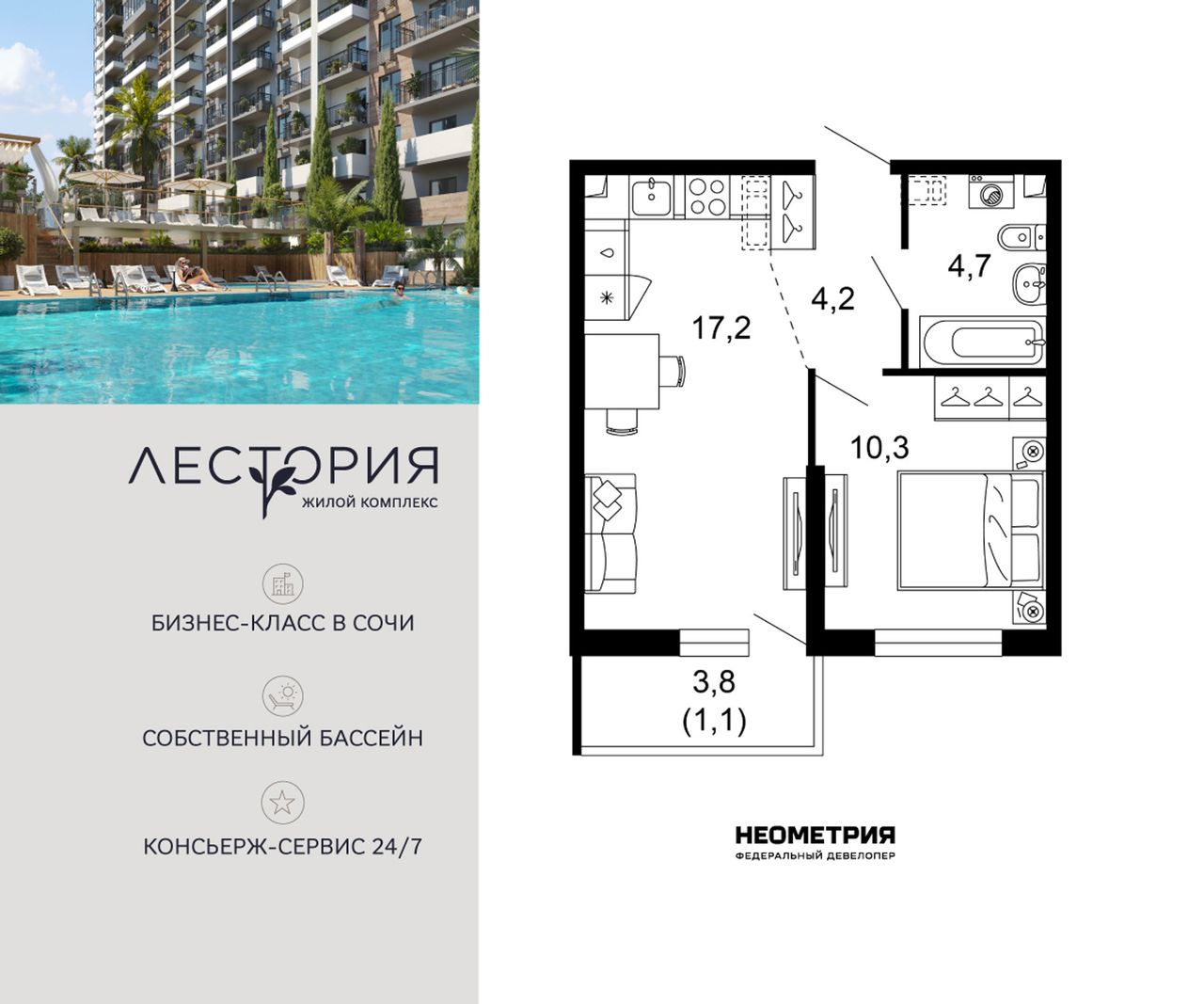 Продается квартира в жилом комплексе бизнес-класса «Лестория». В составе ЖК предусмотрена собственная аквазона площадью 473 квадратных метра с двумя подогреваемыми бассейнами, что соответствуют стандартам бизнес-класса.