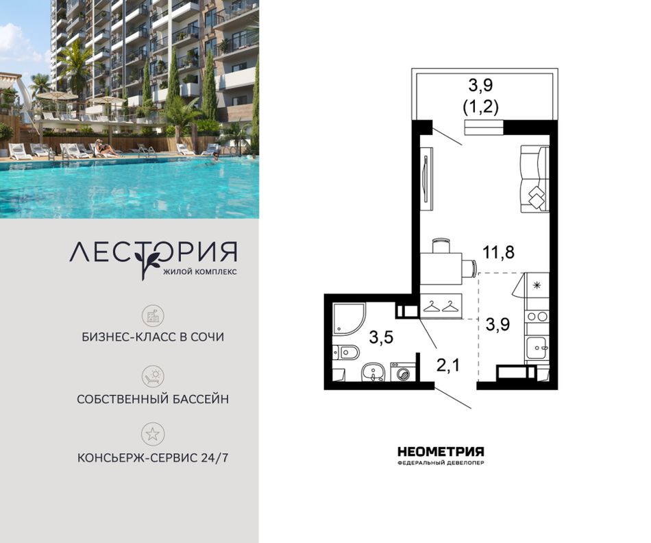 Продается квартира в жилом комплексе бизнес-класса «Лестория». В составе ЖК предусмотрена собственная аквазона площадью 473 квадратных метра с двумя подогреваемыми бассейнами, что соответствуют стандартам бизнес-класса.
