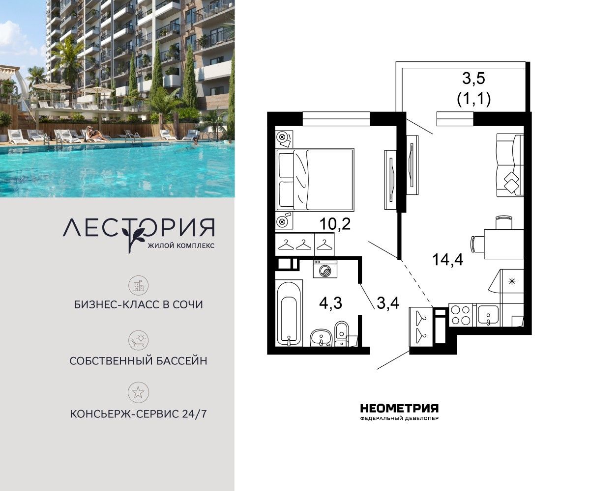 Продается квартира в жилом комплексе бизнес-класса «Лестория». В составе ЖК предусмотрена собственная аквазона площадью 473 квадратных метра с двумя подогреваемыми бассейнами, что соответствуют стандартам бизнес-класса.