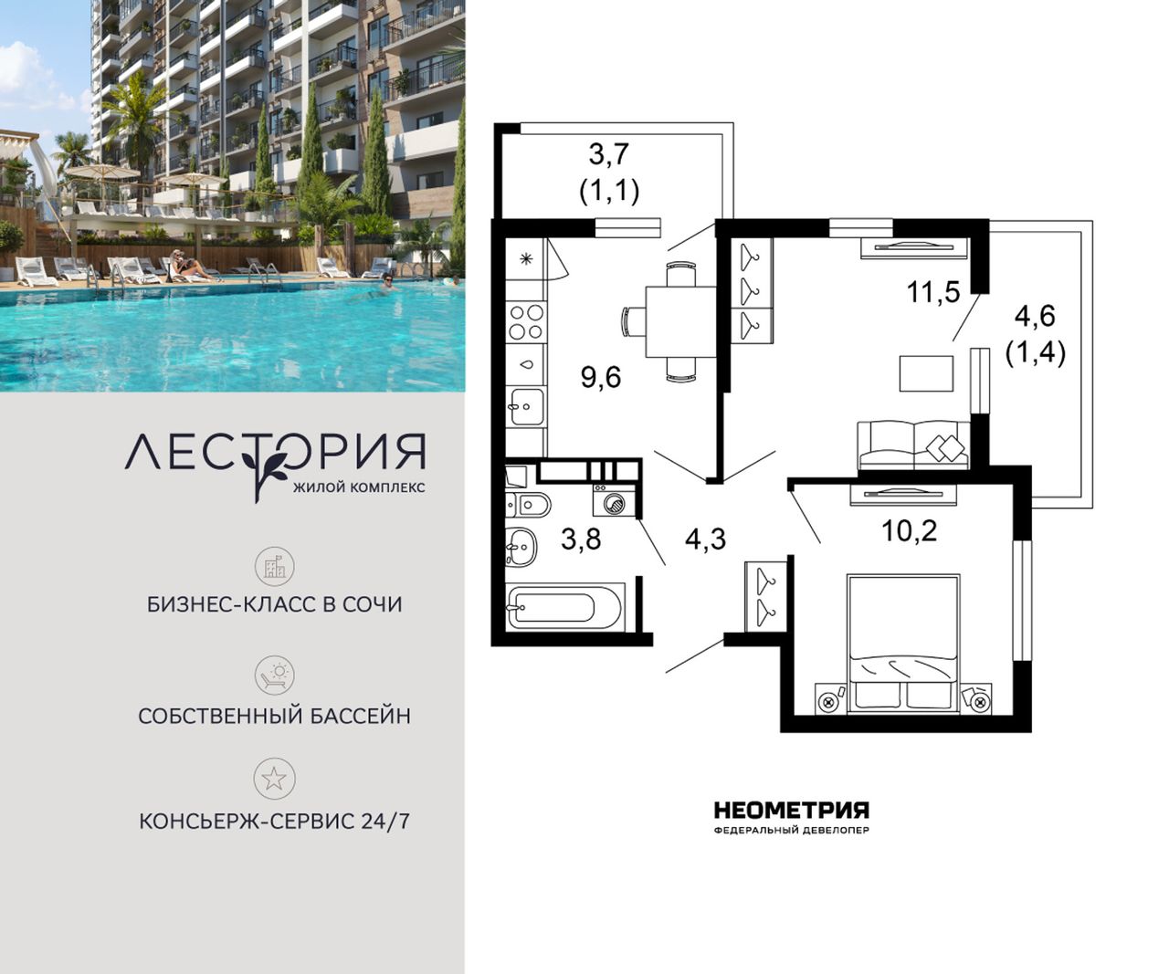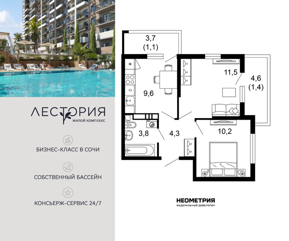 Продается квартира в жилом комплексе бизнес-класса «Лестория». В составе ЖК предусмотрена собственная аквазона площадью 473 квадратных метра с двумя подогреваемыми бассейнами, что соответствуют стандартам бизнес-класса.