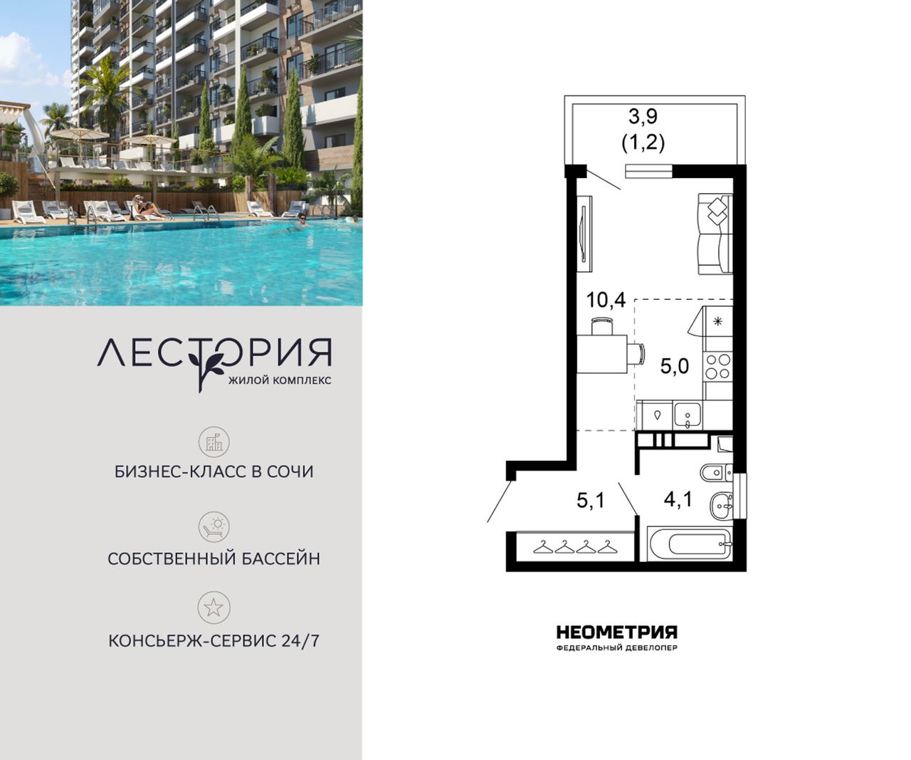 Продается квартира в жилом комплексе бизнес-класса «Лестория». В составе ЖК предусмотрена собственная аквазона площадью 473 квадратных метра с двумя подогреваемыми бассейнами, что соответствуют стандартам бизнес-класса.