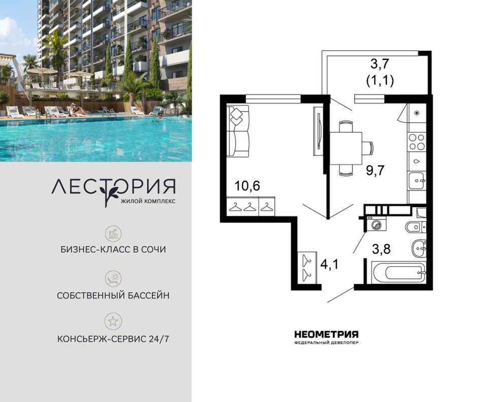 Продается квартира в жилом комплексе бизнес-класса «Лестория». В составе ЖК предусмотрена собственная аквазона площадью 473 квадратных метра с двумя подогреваемыми бассейнами, что соответствуют стандартам бизнес-класса.