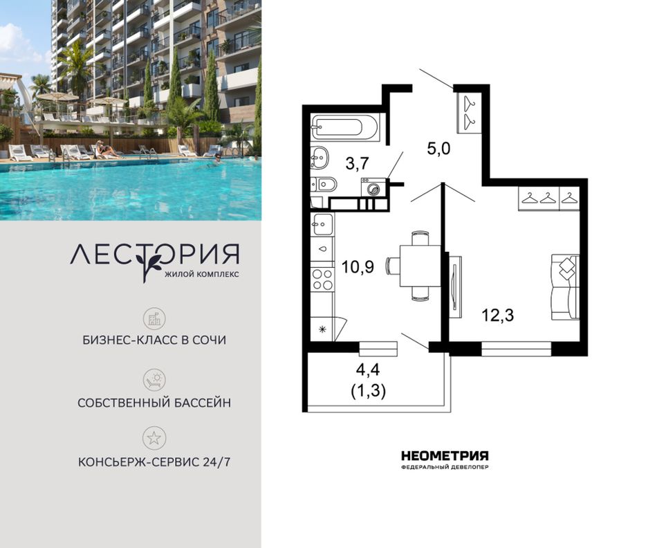 Продается квартира в жилом комплексе бизнес-класса «Лестория». В составе ЖК предусмотрена собственная аквазона площадью 473 квадратных метра с двумя подогреваемыми бассейнами, что соответствуют стандартам бизнес-класса.