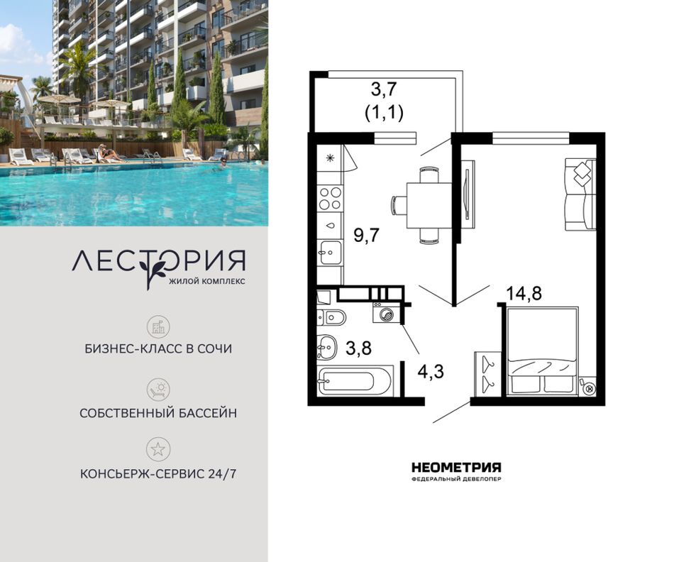 Продается квартира в жилом комплексе бизнес-класса «Лестория». В составе ЖК предусмотрена собственная аквазона площадью 473 квадратных метра с двумя подогреваемыми бассейнами, что соответствуют стандартам бизнес-класса.