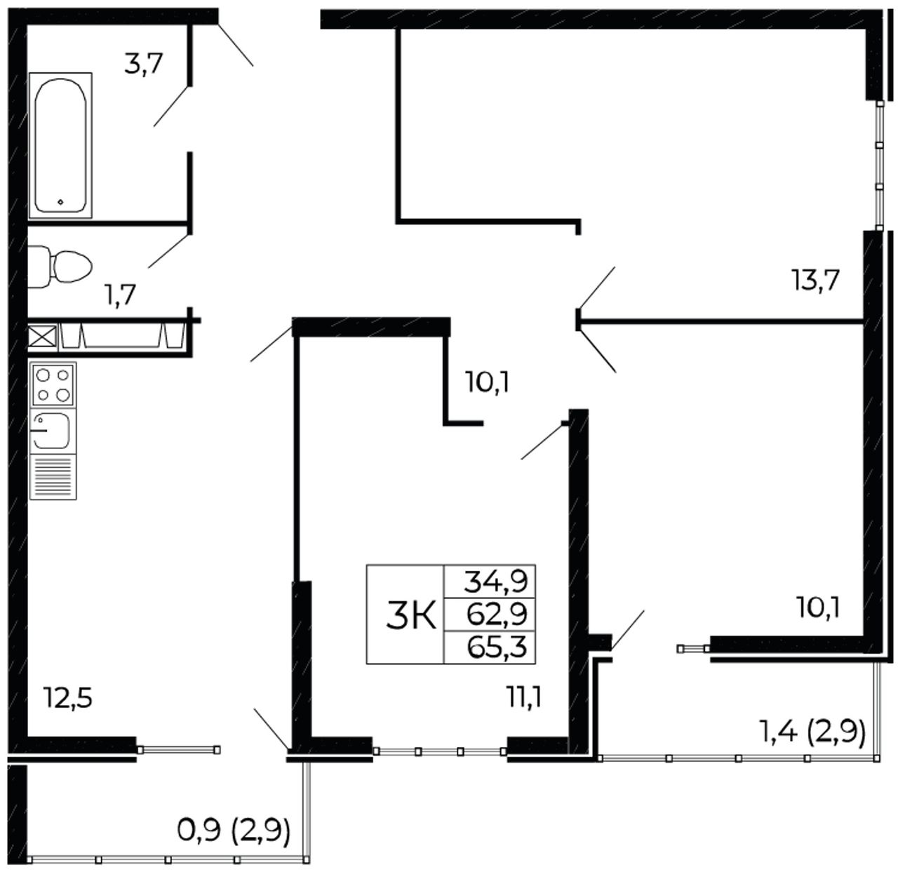 3-комнатная — 65,3 м² 9/19 эт. в Западные Аллеи