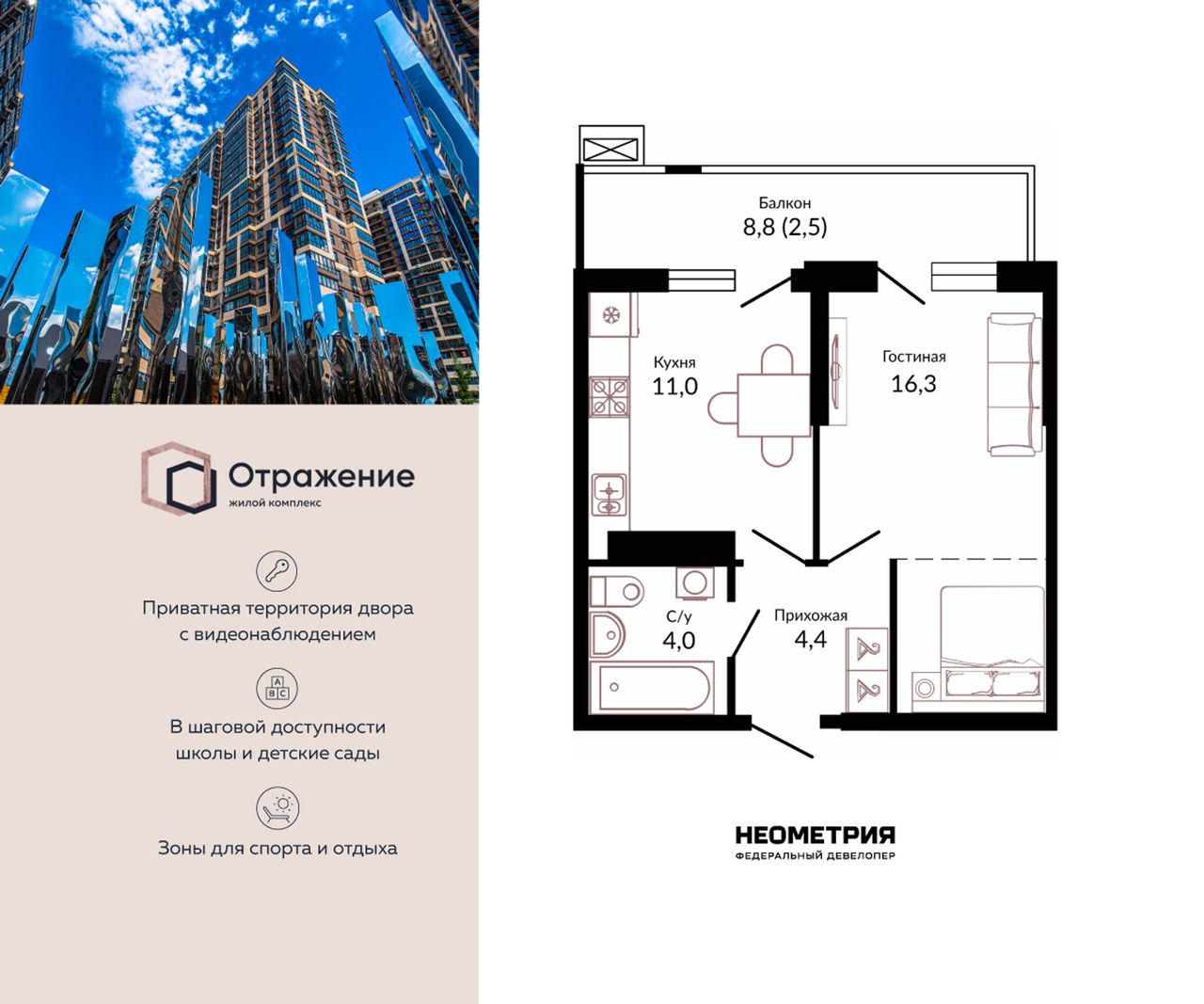 Продается квартира в жилом комплексе «Отражение». Это новый стандарт комфортного проживания от федерального девелопера «Неометрия».