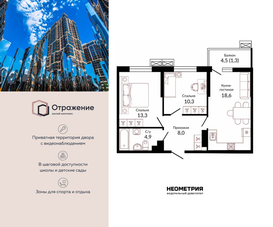 Продается квартира в жилом комплексе «Отражение». Это новый стандарт комфортного проживания от федерального девелопера «Неометрия».