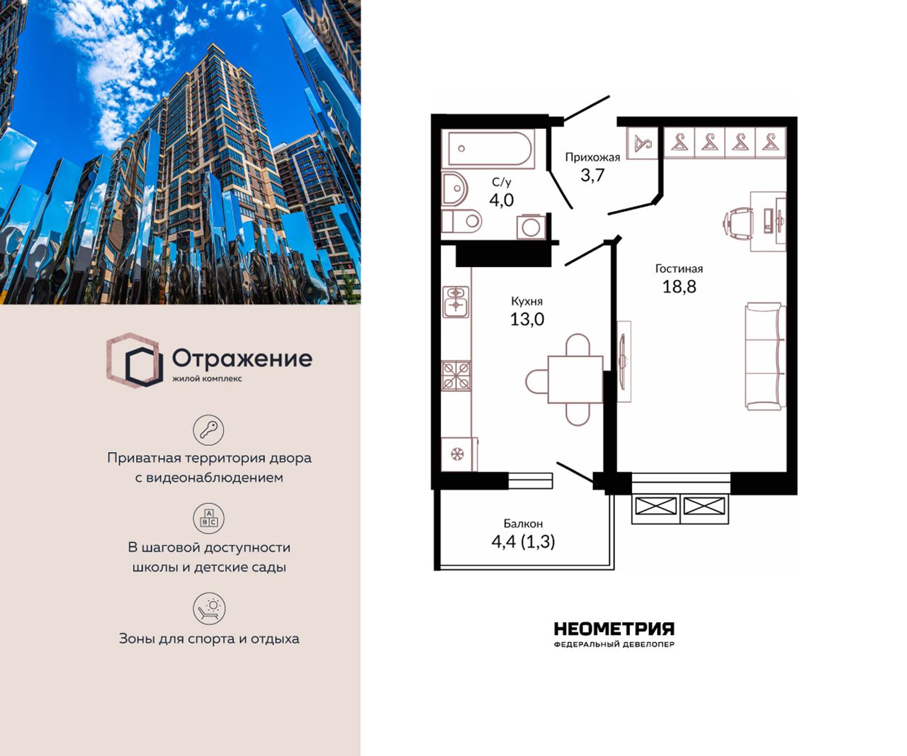 Продается квартира в жилом комплексе «Отражение». Это новый стандарт комфортного проживания от федерального девелопера «Неометрия».
