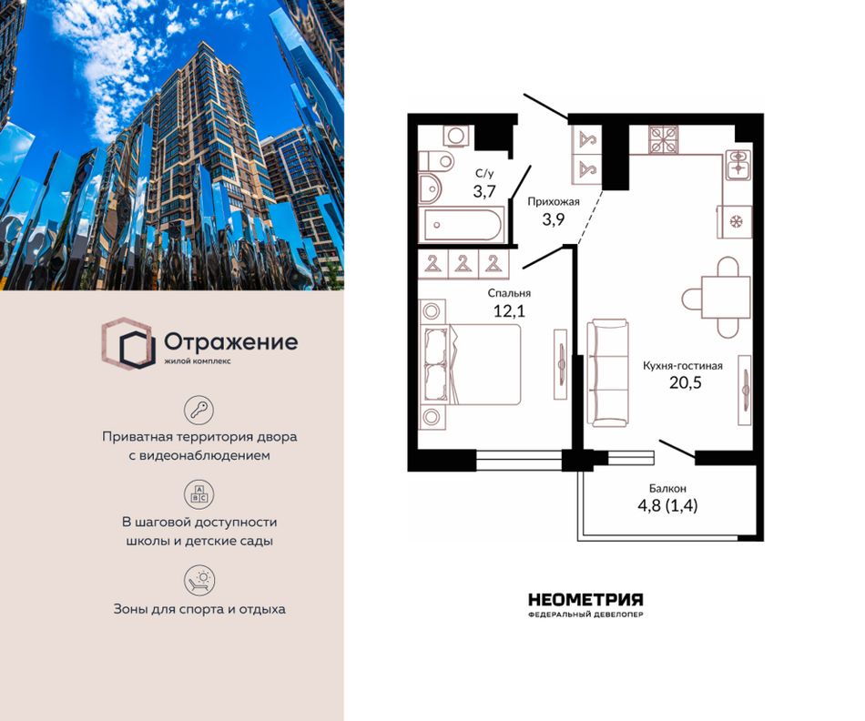 Продается квартира в жилом комплексе «Отражение». Это новый стандарт комфортного проживания от федерального девелопера «Неометрия».
