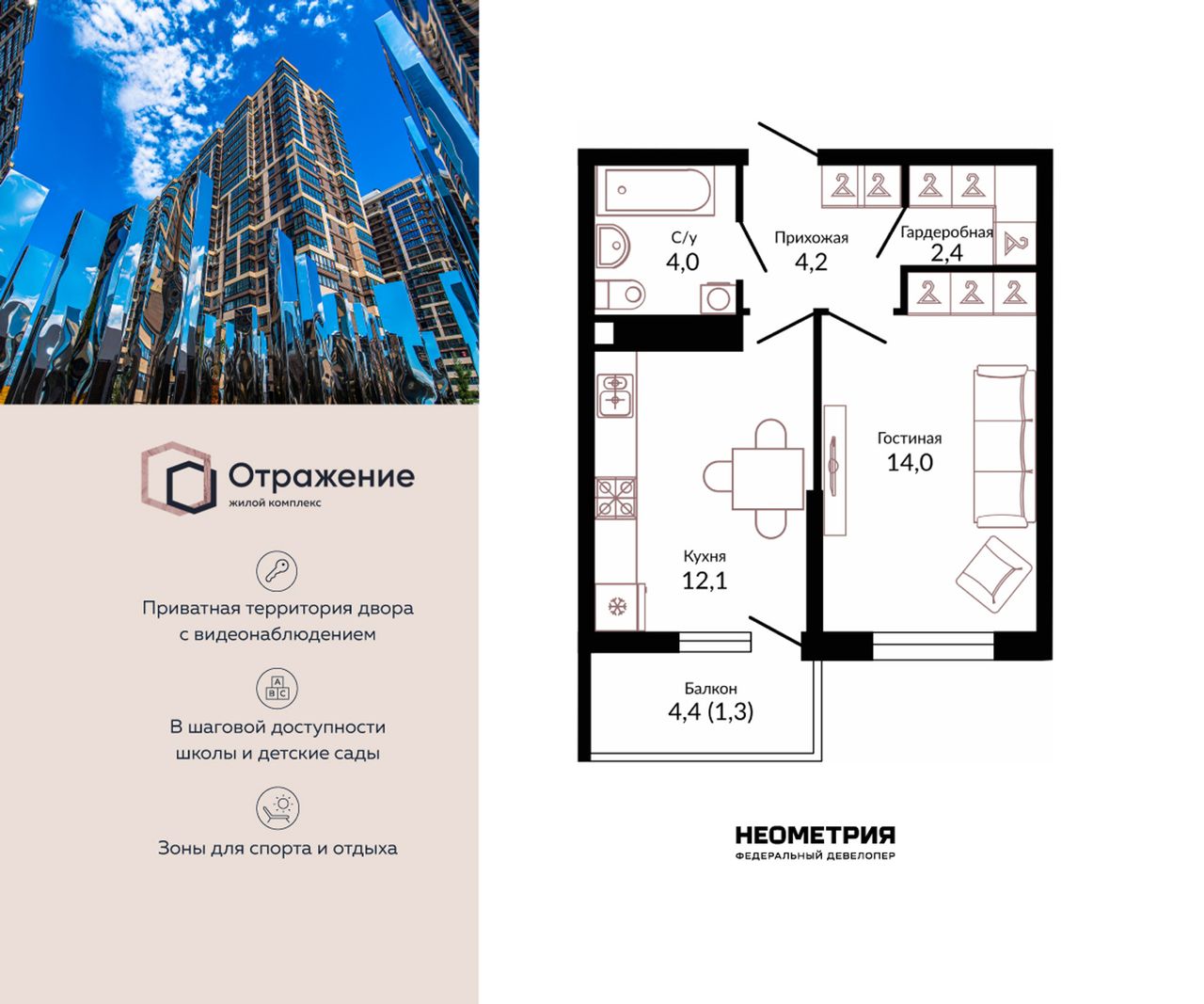 Продается квартира в жилом комплексе «Отражение». Это новый стандарт комфортного проживания от федерального девелопера «Неометрия».