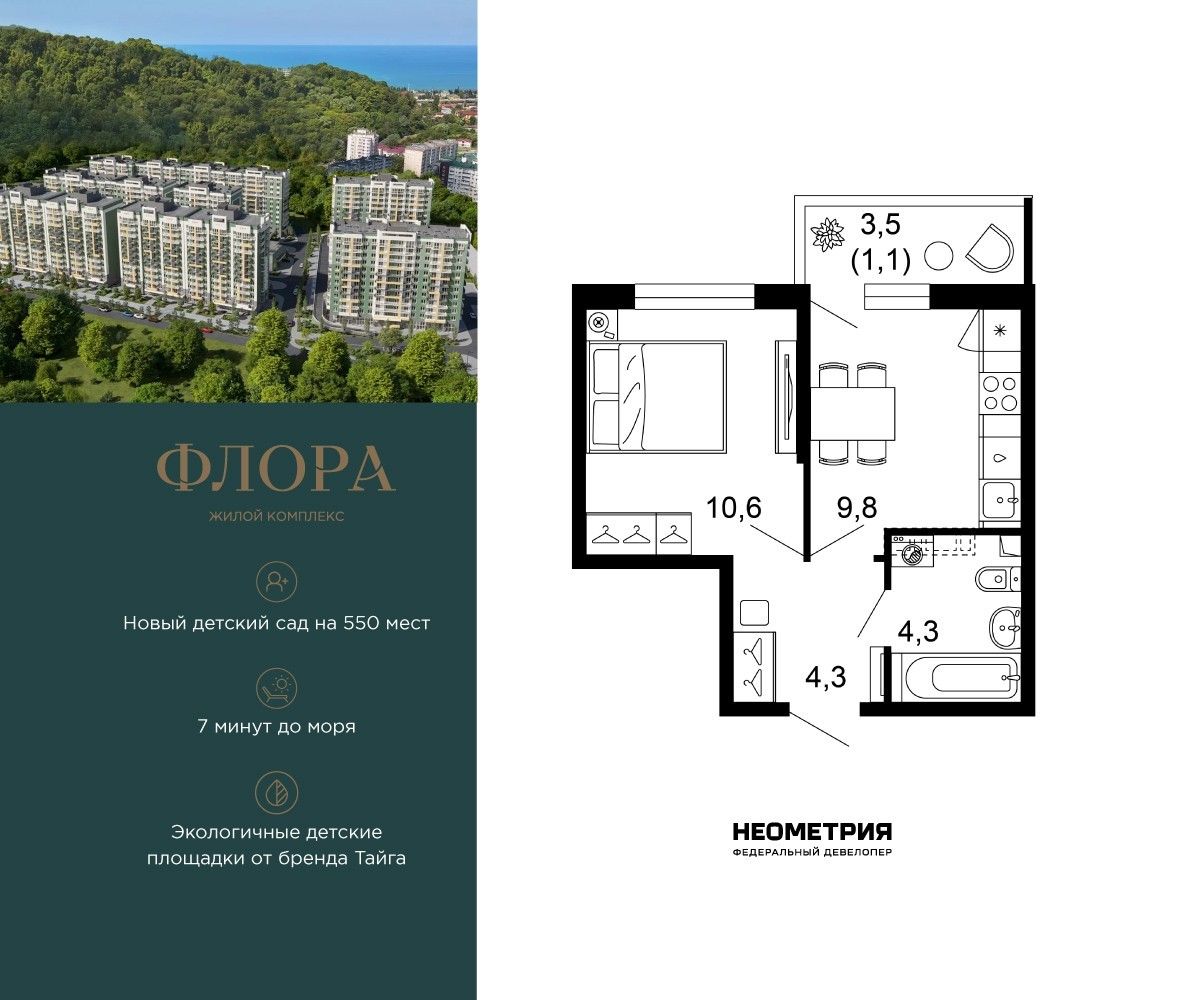 Продается квартира в ЖК «Флора» от федерального девелопера «Неометрия». Это жилой комплекс комфорт-класса в самом зеленом районе Сочи. При проектировании постарались максимально сохранить окружающую флору и фауну. Теплое море, горы, целебные источники, река, близость заповедника – все это уже рядом с вами.