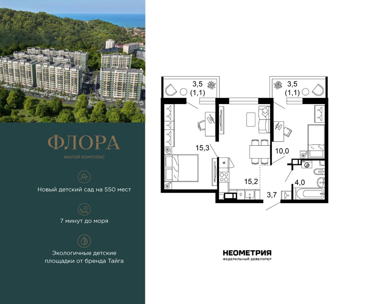 Продается квартира в ЖК «Флора» от федерального девелопера «Неометрия». Это жилой комплекс комфорт-класса в самом зеленом районе Сочи. При проектировании постарались максимально сохранить окружающую флору и фауну. Теплое море, горы, целебные источники, река, близость заповедника – все это уже рядом с вами.