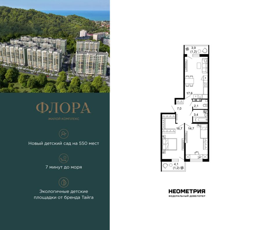Продается квартира в ЖК «Флора» от федерального девелопера «Неометрия». Это жилой комплекс комфорт-класса в самом зеленом районе Сочи. При проектировании постарались максимально сохранить окружающую флору и фауну. Теплое море, горы, целебные источники, река, близость заповедника – все это уже рядом с вами.
