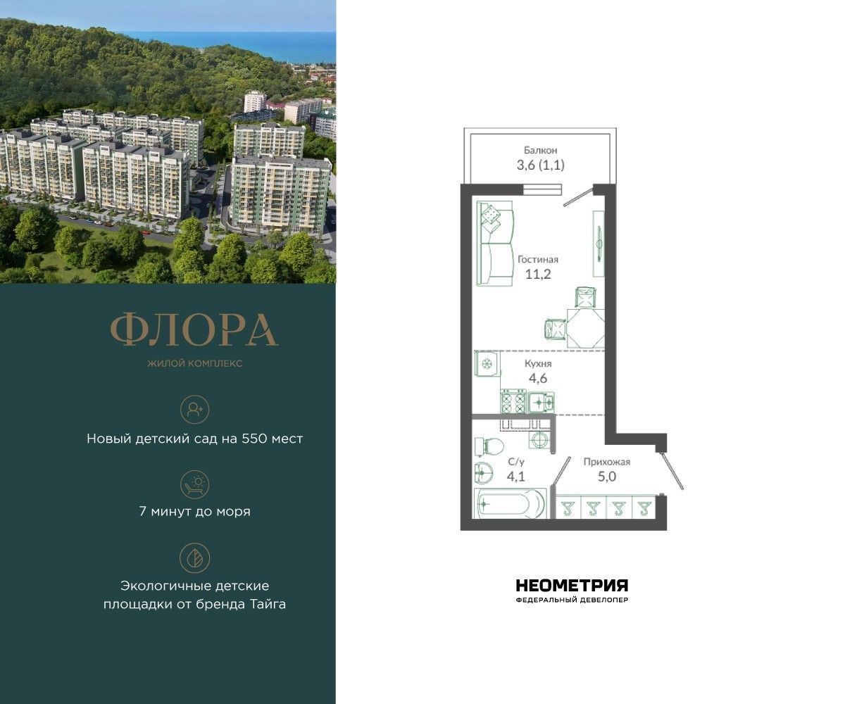 Продается квартира в ЖК «Флора» от федерального девелопера «Неометрия». Это жилой комплекс комфорт-класса в самом зеленом районе Сочи. При проектировании постарались максимально сохранить окружающую флору и фауну. Теплое море, горы, целебные источники, река, близость заповедника – все это уже рядом с вами.