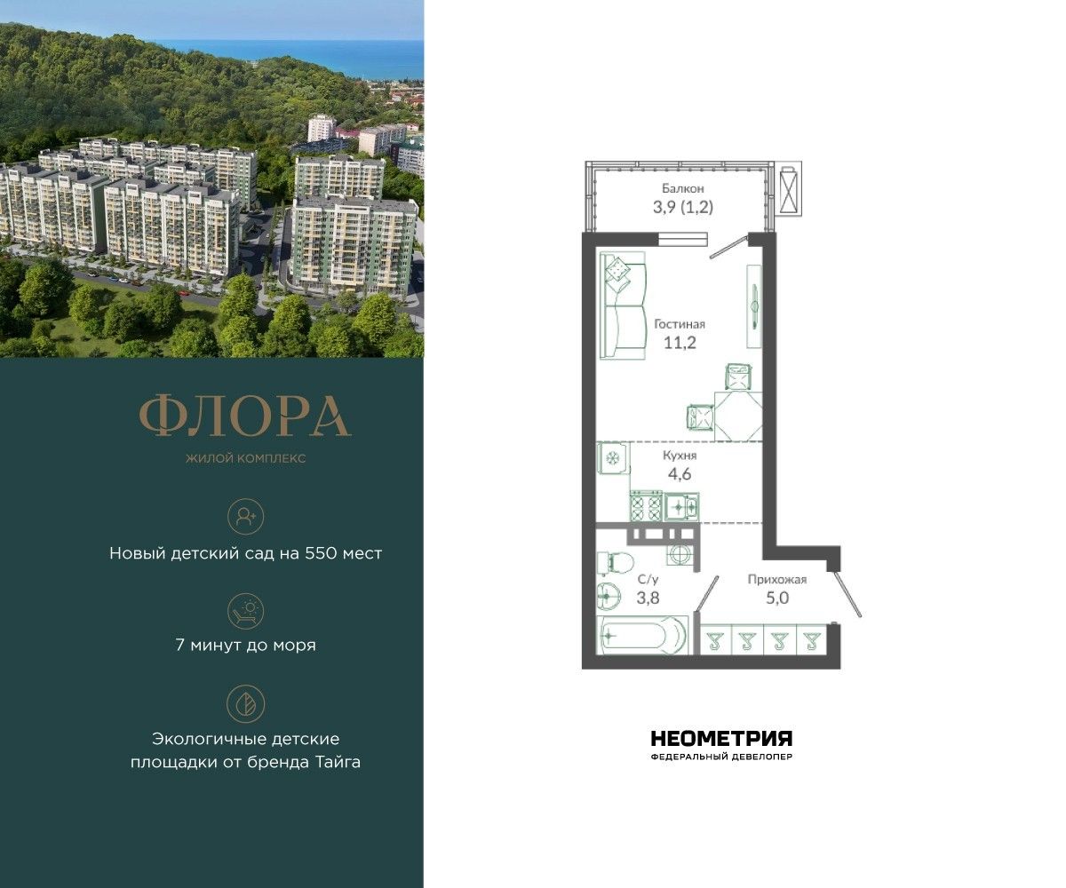 Продается квартира в ЖК «Флора» от федерального девелопера «Неометрия». Это жилой комплекс комфорт-класса в самом зеленом районе Сочи. При проектировании постарались максимально сохранить окружающую флору и фауну. Теплое море, горы, целебные источники, река, близость заповедника – все это уже рядом с вами.