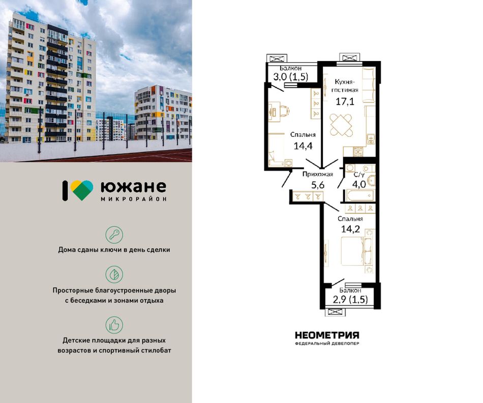 Продаётся квартира в сданном жилом комплексе «Южане» от надёжного застройщика «Неометрия». Это идеальное место для тех, кто мечтает о комфортной жизни в районе с развитой инфраструктурой.
