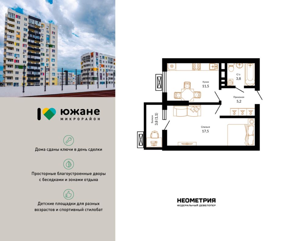 Продаётся квартира в сданном жилом комплексе «Южане» от надёжного застройщика «Неометрия». Это идеальное место для тех, кто мечтает о комфортной жизни в районе с развитой инфраструктурой.