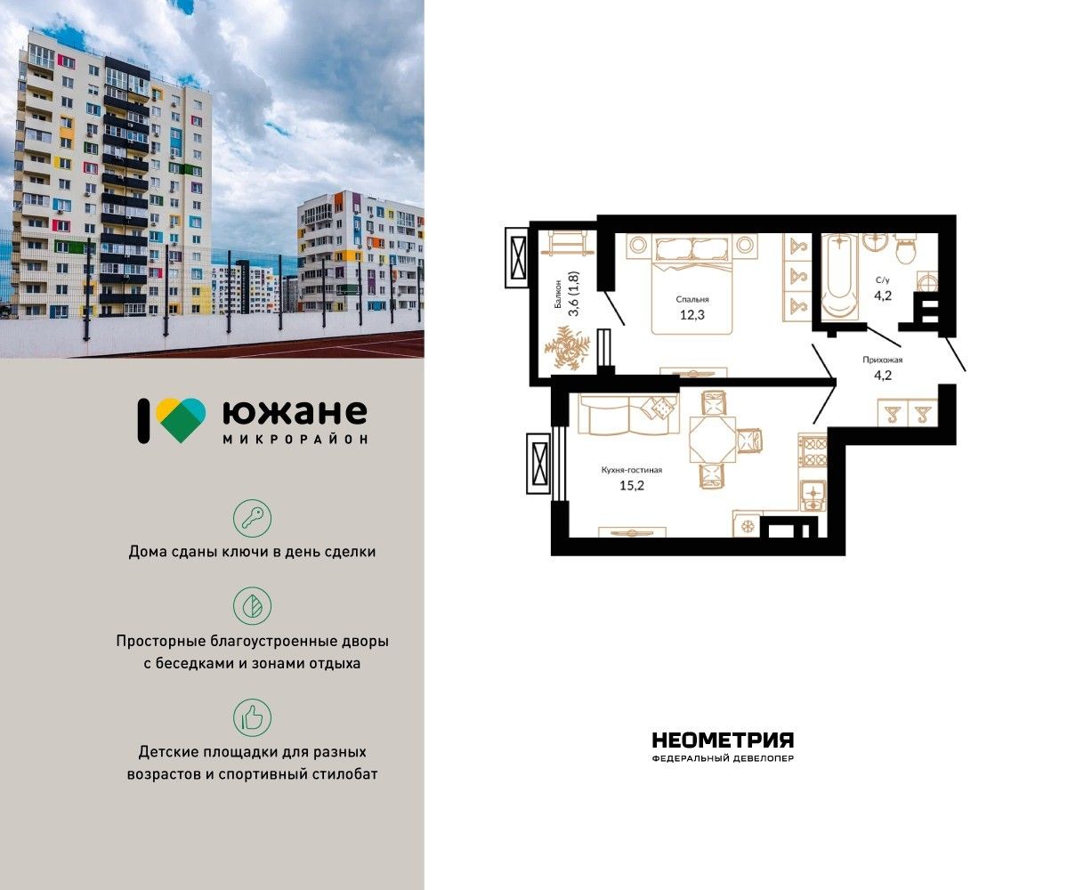 Продаётся квартира в сданном жилом комплексе «Южане» от надёжного застройщика «Неометрия». Это идеальное место для тех, кто мечтает о комфортной жизни в районе с развитой инфраструктурой.