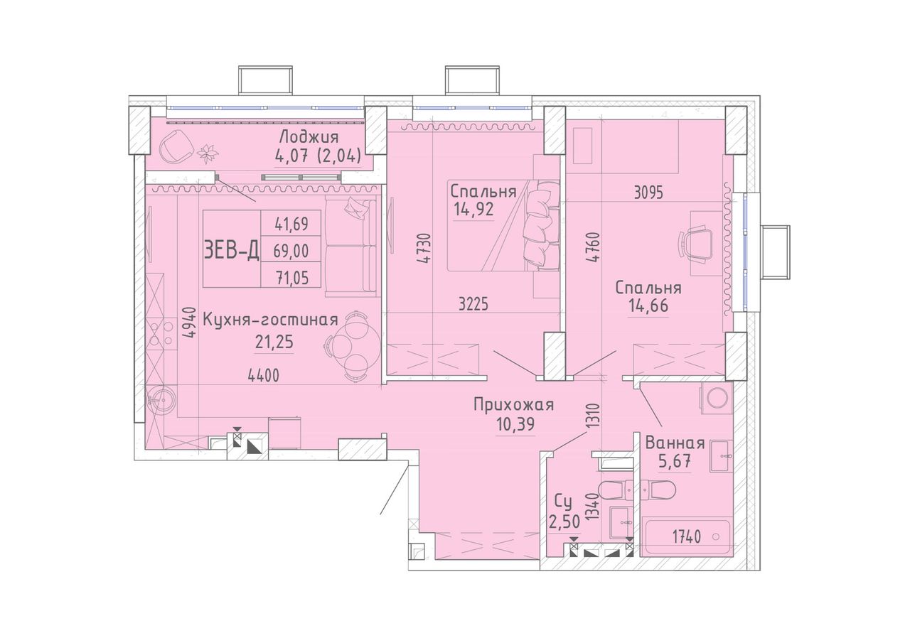 2-комнатная — 71,05 м² 3/12 эт. в Орион