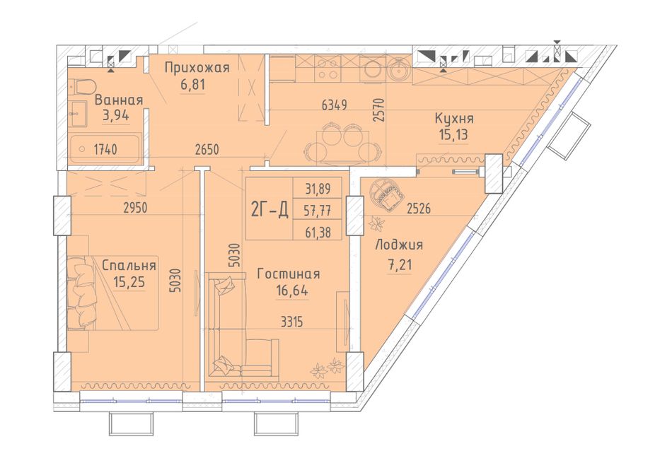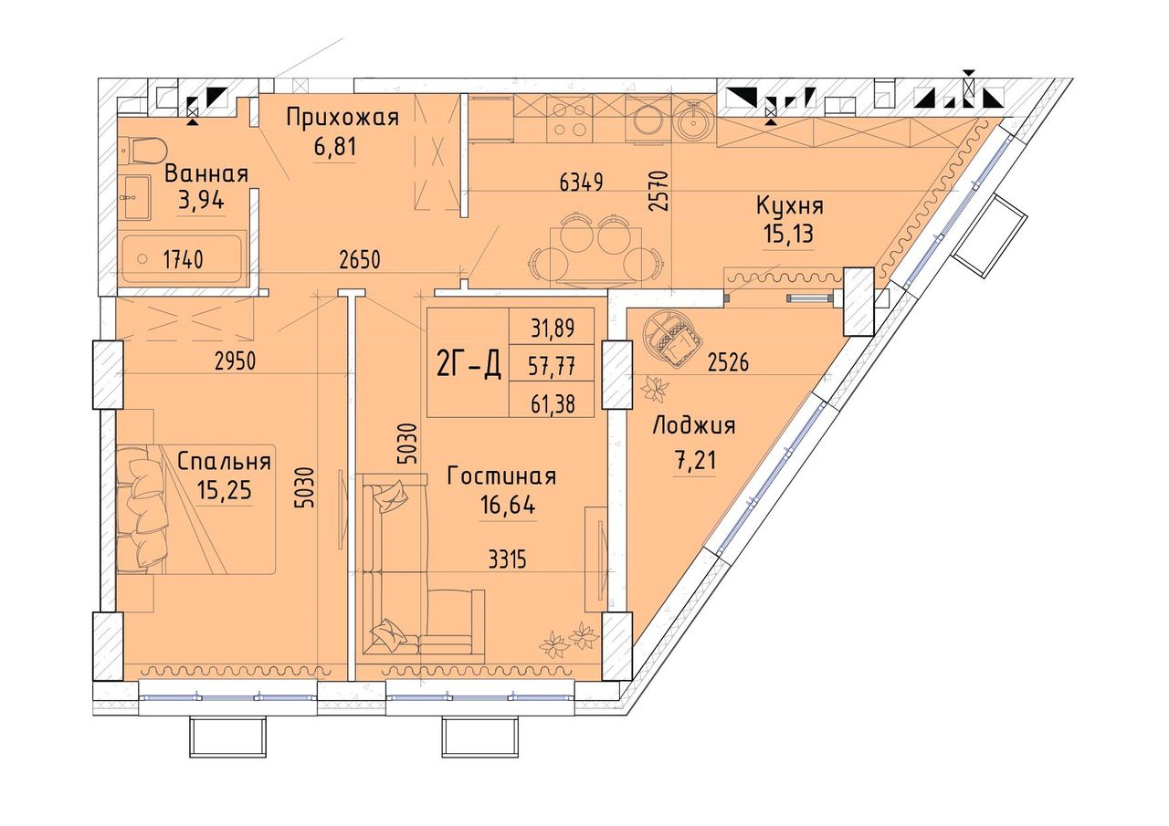 2-комнатная — 61,33 м² 11/12 эт. в Орион