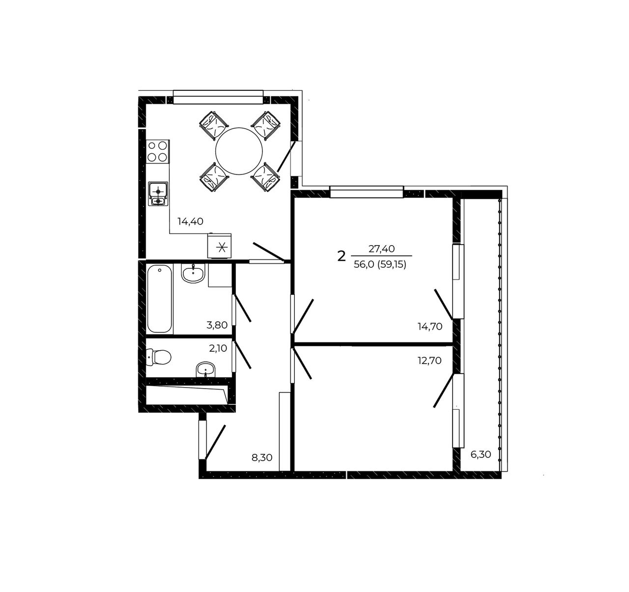 2-комнатная — 59,15 м² 5/19 эт. в Притяжение