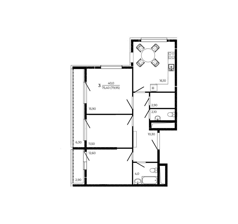 3-комнатная — 79,95 м² 17/19 эт. в Притяжение