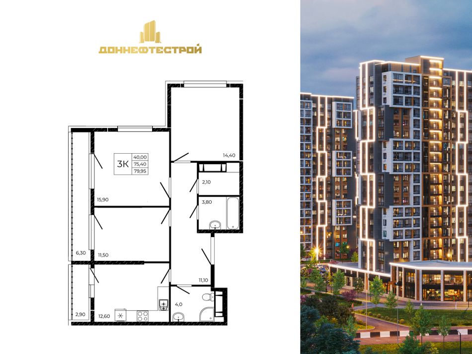 3-комнатная — 79,95 м² 19/19 эт. в Притяжение