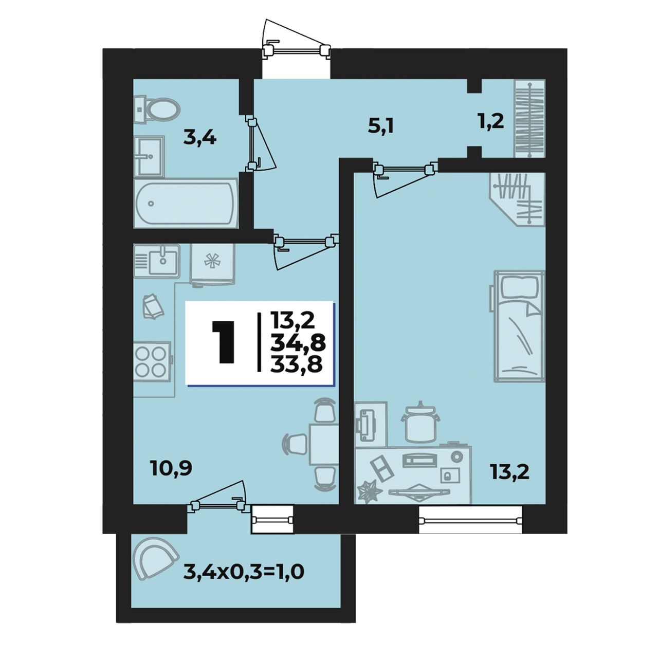 1-комнатная — 34,8 м² 5/5 эт. в Дарград
