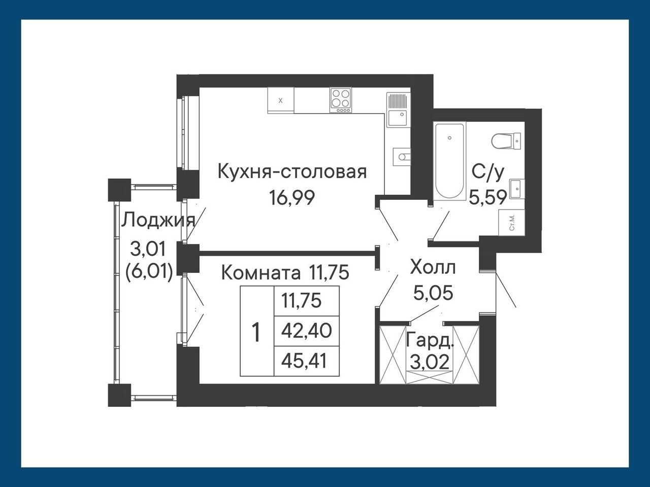 1-комнатная — 45,41 м² 6/8 эт. в Ривьера