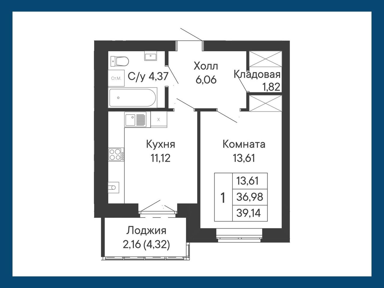 1-комнатная — 39,14 м² 5/8 эт. в Ривьера