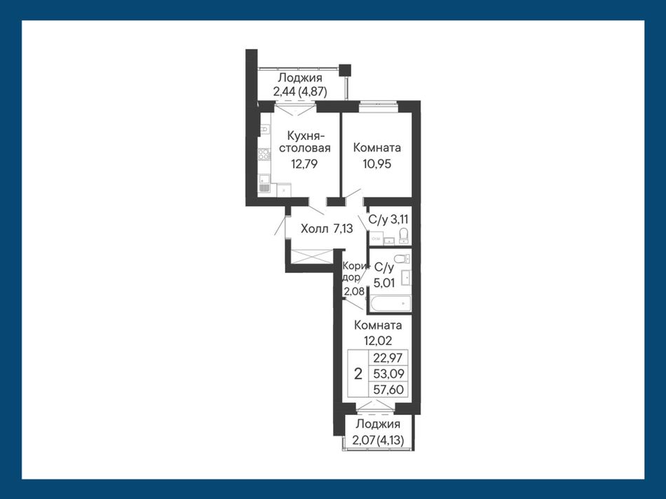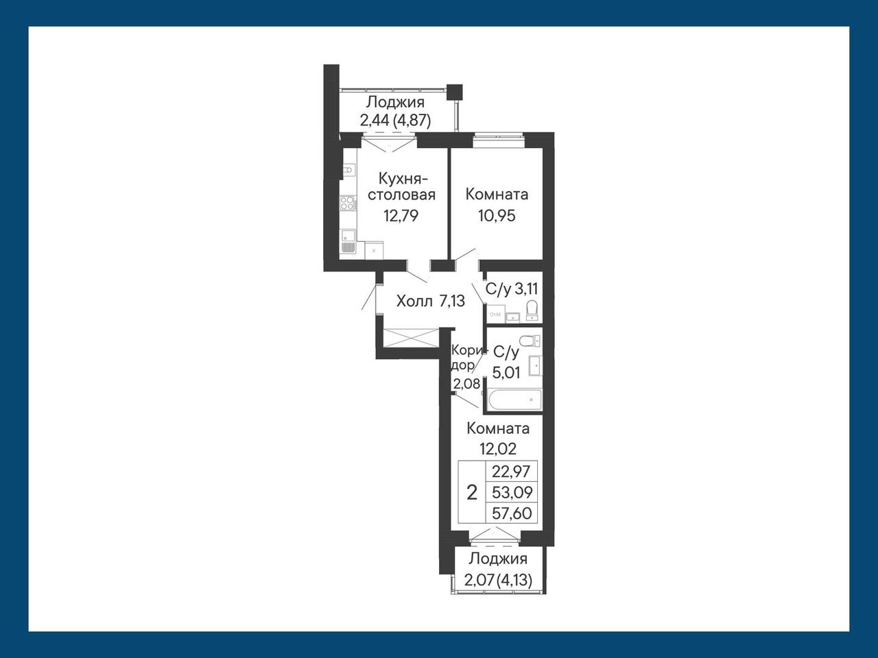 2-комнатная — 57,6 м² 6/8 эт. в Ривьера