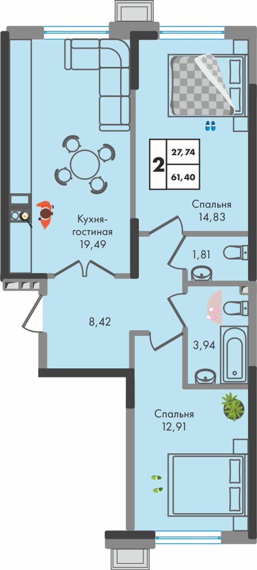2-комнатная — 61,4 м² 2/9 эт. в Зелёная территория