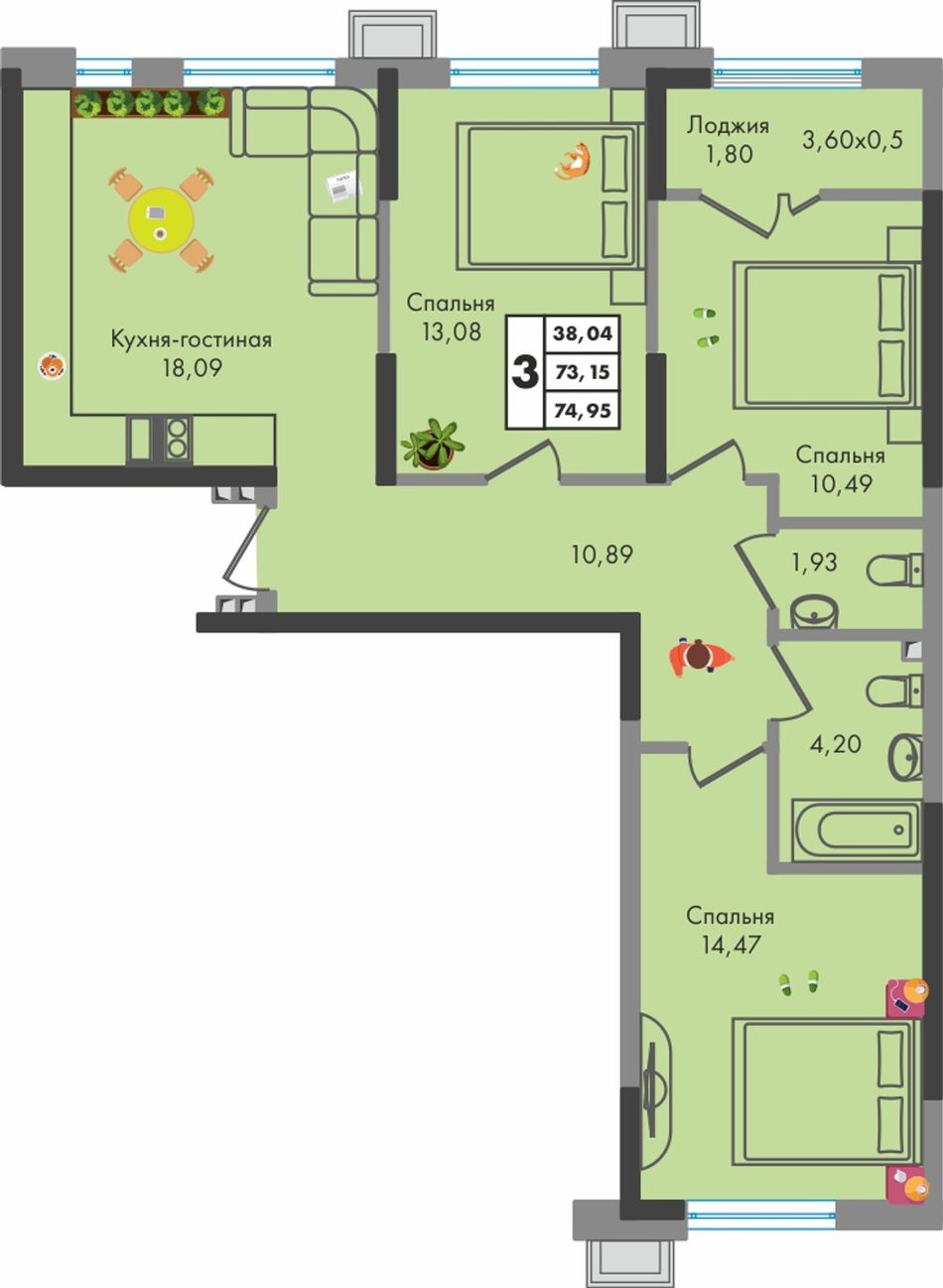 3-комнатная — 74,95 м² 9/9 эт. в Зелёная территория