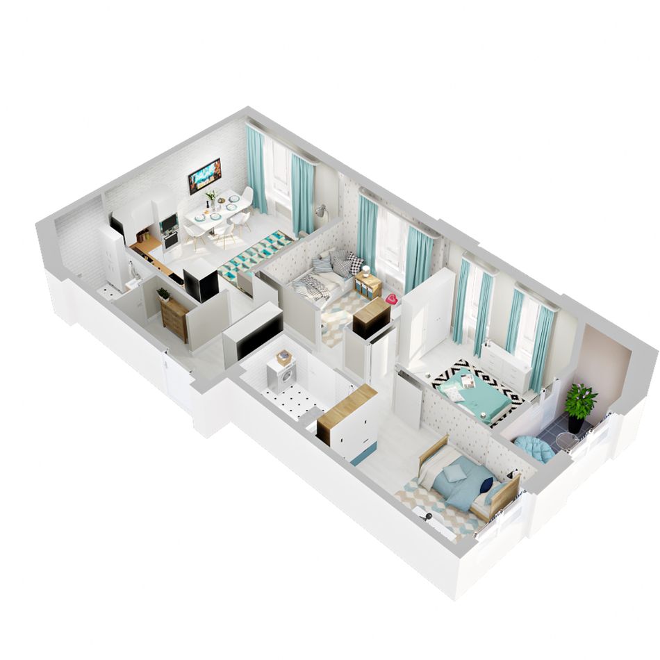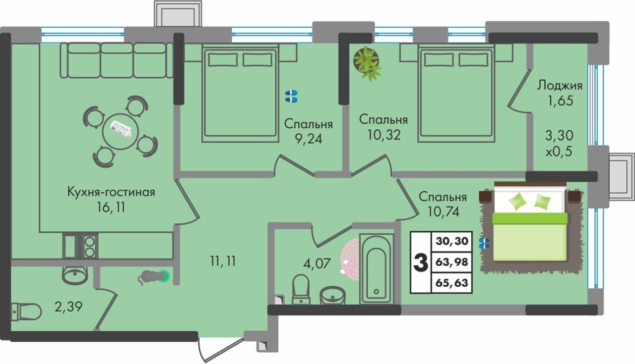 3-комнатная — 65,7 м² 8/9 эт. в Зелёная территория