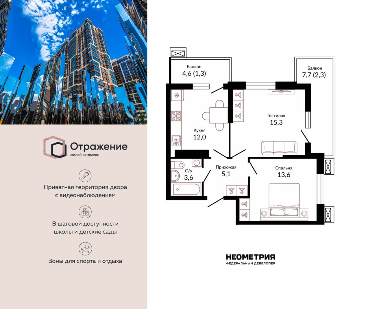 Продается квартира в жилом комплексе «Отражение». Это новый стандарт комфортного проживания от федерального девелопера «Неометрия».