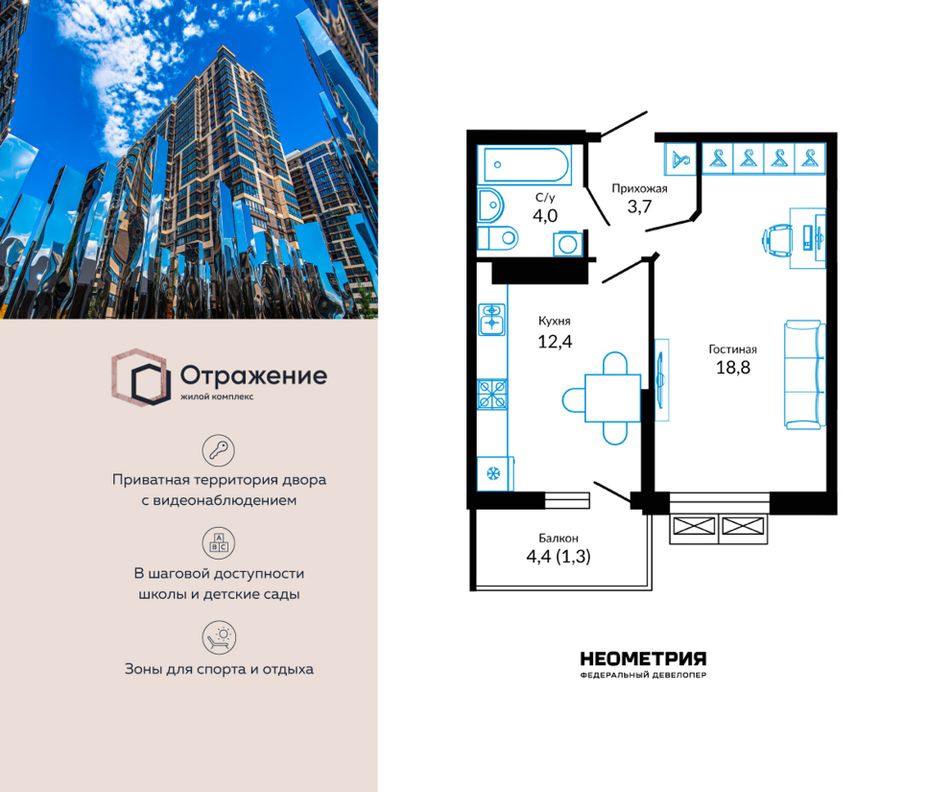Продается квартира в жилом комплексе «Отражение». Это новый стандарт комфортного проживания от федерального девелопера «Неометрия».