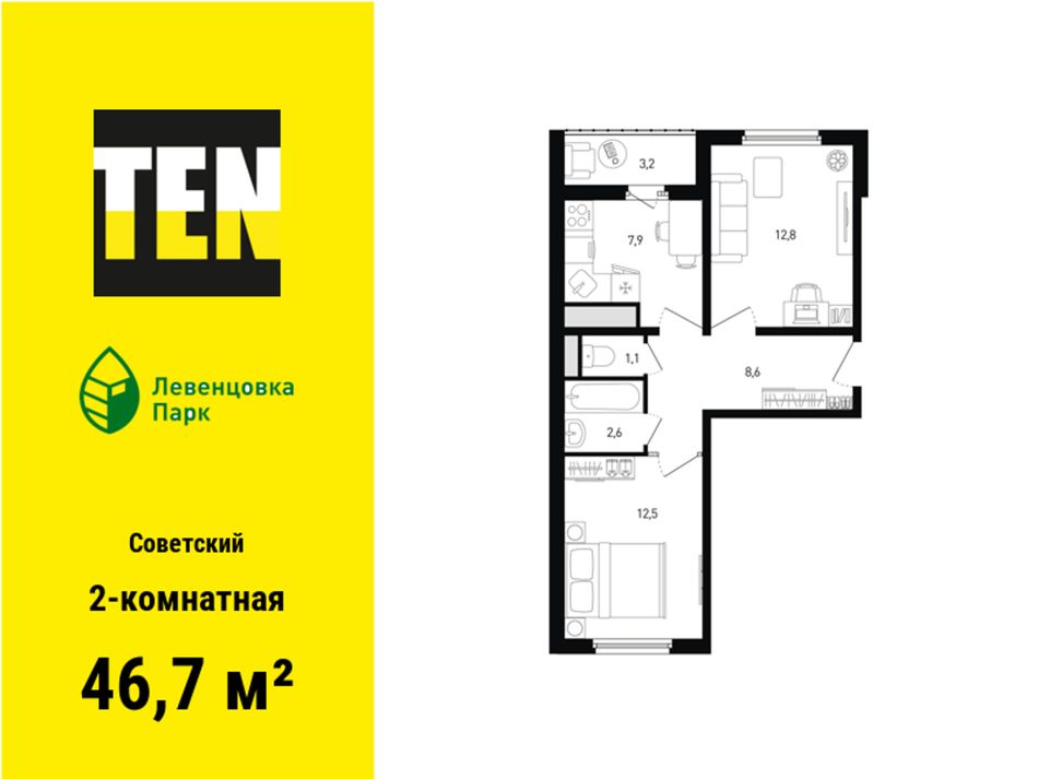 2-комнатная — 46,7 м² 10/12 эт. в Концепт-проект «Левенцовка Парк»
