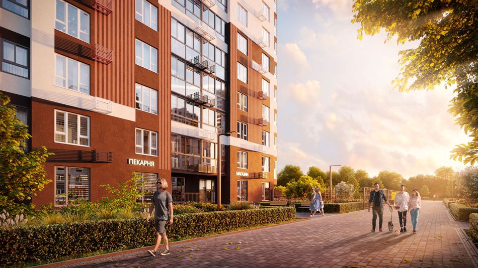 Яркие фасады, закрытый двор, два детских садика, школа, благоустроенные зоны отдыха с бесплатным Wi-Fi на всей территории.