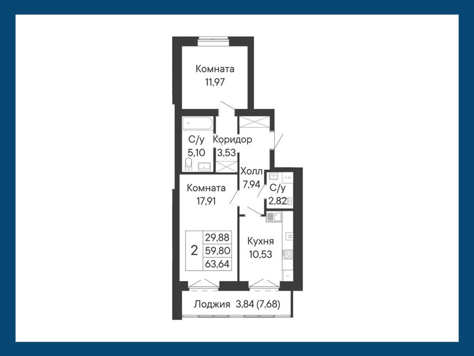 2-комнатная — 63,64 м² 5/8 эт. в Ривьера
