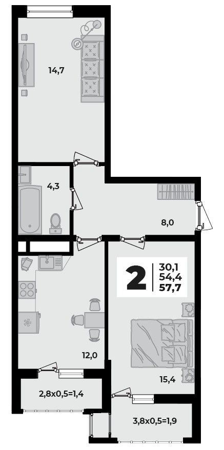 2-комнатная — 57,7 м² 3/8 эт. в Родной дом 2