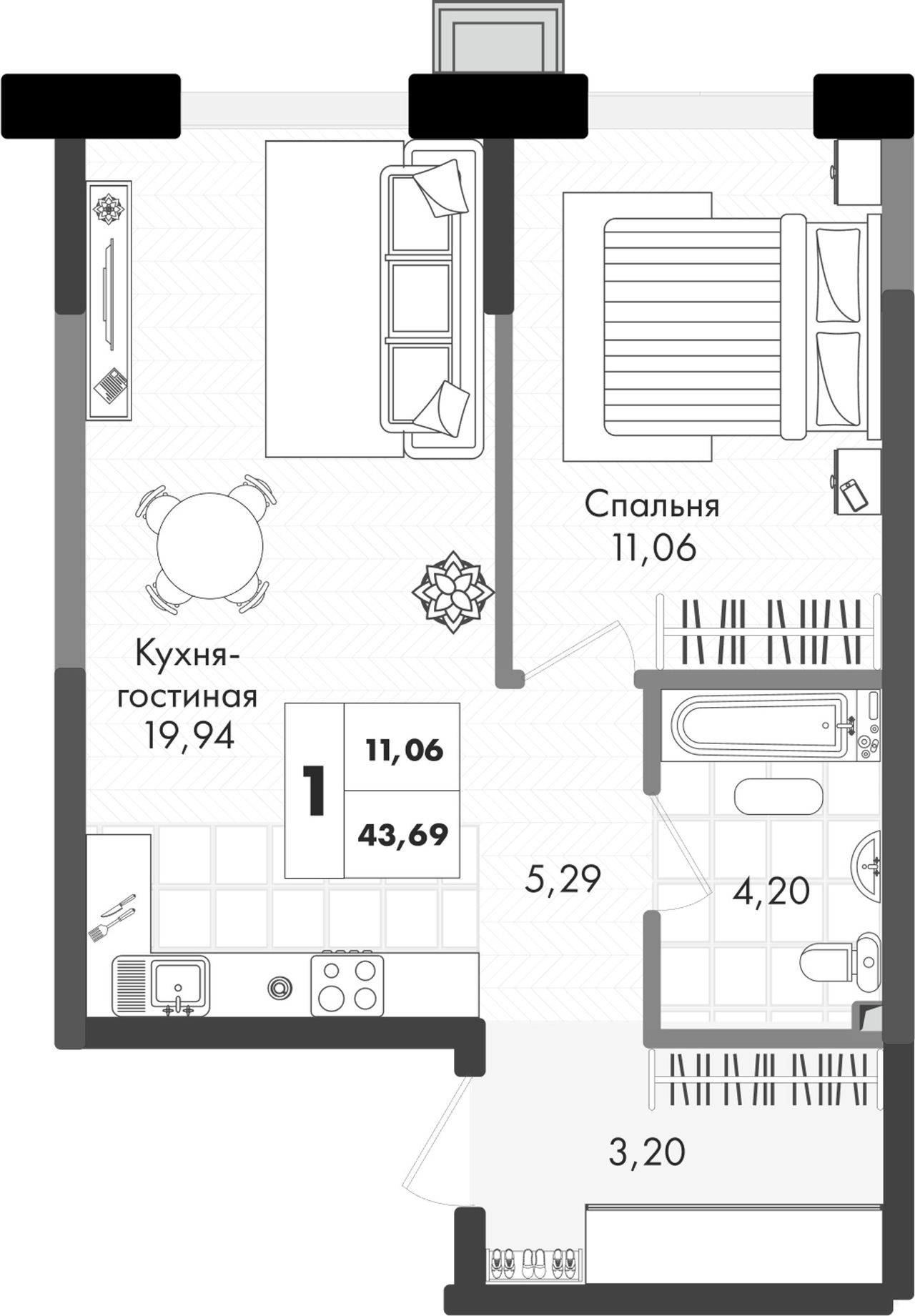 Общая площадь43,69 м²