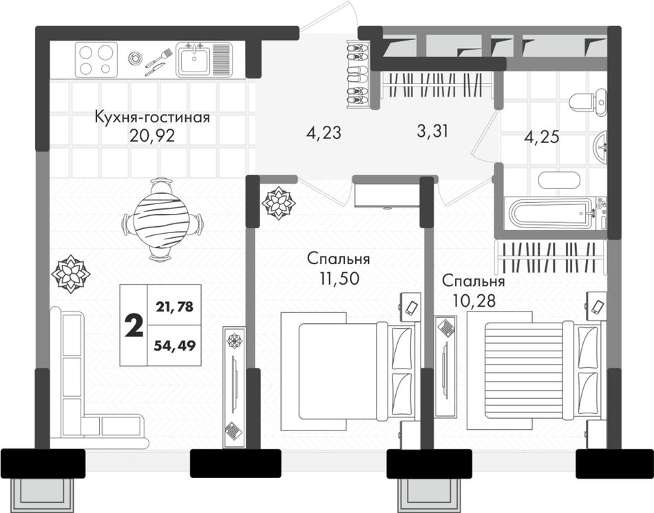 Общая площадь54,49 м²