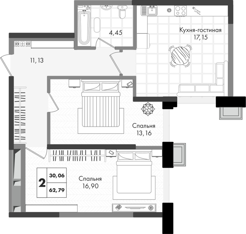 2-комнатная — 62,79 м² 2/9 эт. в Зелёная территория