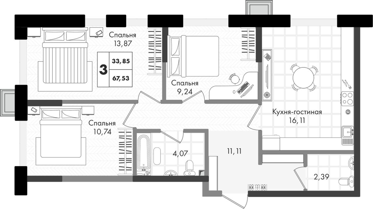 3-комнатная — 67,53 м² 7/9 эт. в Зелёная территория